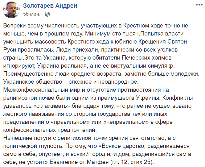 Политолог Андрей Золотарев считает, что на крестный ход сегодня вышла "та Украина, которую обитатели Печерских холмов игнорируют".