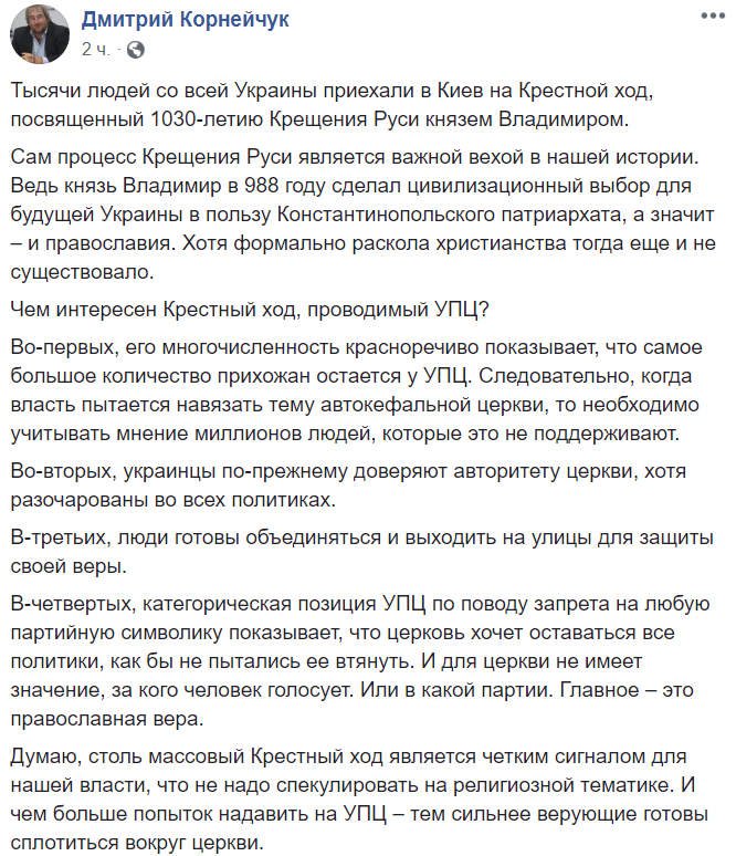 Политолог Дмитрий Корнейчук пишет, что после появления такого количества верующих на улицах Киева власти нужно перестать спекулировать на религиозных вопросах.