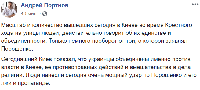 "Масштаб и количество вышедших сегодня в Киеве во время крестного хода на улицы людей, действительно говорит об их единстве и объединенности. Только немного наоборот от той, о которой заявлял Порошенко.