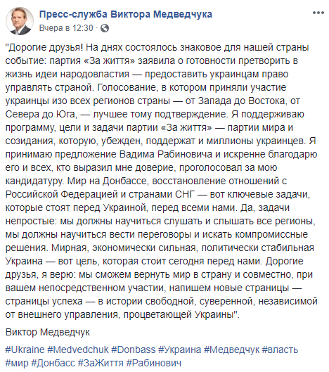 Медведчук сообщил, что вошел в партию "За жизнь"