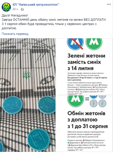В Киевском метрополитене сегодня, 31 июля, последний день, когда можно обменять синие жетоны на зеленые без доплаты. Об этом идет речь в сообщении пресс-службы киевского метрополитена в соцсети Facebook.