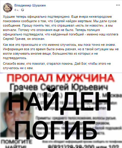 "Худшее теперь официально подтверждено. Еще вчера нижегородские поисковики сообщили о том, что Сергей найден мертвым… Теперь полиция официально подтвердила, что найденный погибший - именно наш коллега Сергей Грачев, он опознан", - написал Шушкин.