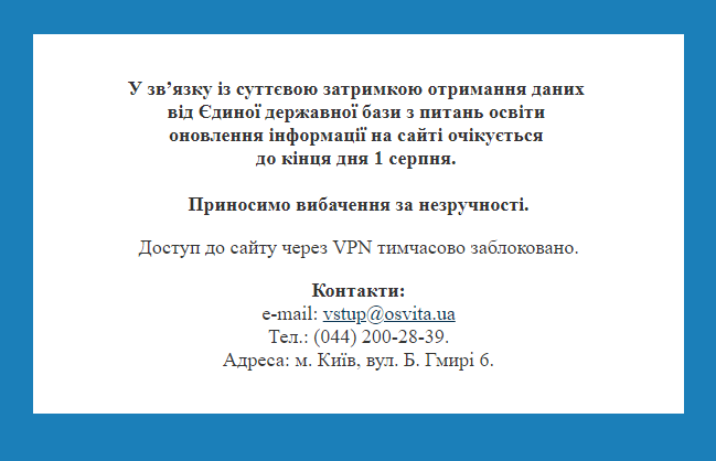 "В связи с существенной задержкой получения данных от Единой государственной базы по вопросам образования обновление информации на сайте ожидается до конца дня 1 августа. Приносим извинения за неудобства. Доступ к сайту через VPN временно заблокирован", - говорится в сообщении.