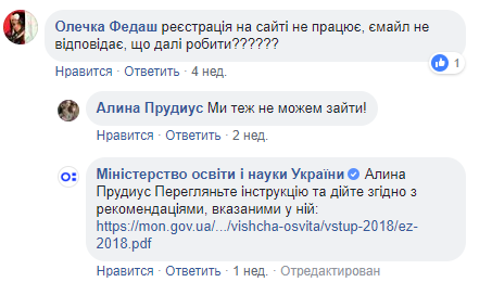 Некоторые абитуриенты оставляют свои жалобы о проблеме с доступом в электронный кабинет на странице Минобразования и науки Украины в соцсети Facebook.