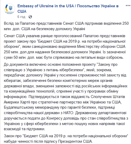 "Сенат США принял ранее проголосованный Палатой представителей проект закона о "Бюджете США на 2019 на нужды национальной обороны", которым санкционировано выделение Министерству обороны США $250 миллионов для предоставления помощи Украине. Из указанной суммы $50 миллионов должно быть направлено на летальные виды вооружений.