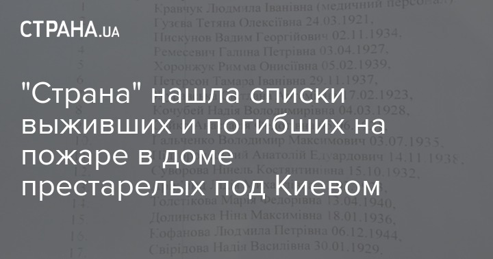 Списки выживших и погибших в результате пожара в доме престарелых в селе Литочки, что в Броварском районе Киевской области, оказались в распоряжении корреспондента "Страны". В них указаны имена и фамилии постояльцев домовладения, а также место их расположения в настоящий момент.