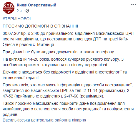 В Больнице Василькова находится неизвестная девушка, пострадавшая в результате ДТП на трассе Киев-Одесса в районе с. Митниця.