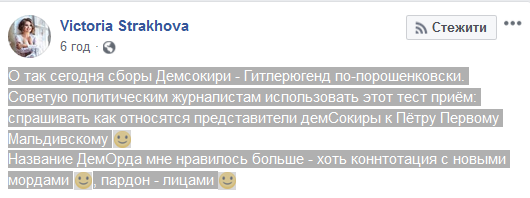 "О, так сегодня сборы Демсокири - Гитлерюгенд по-порошенковски. Советую политическим журналистам использовать этот тест-прием: спрашивать как относятся представители демСокиры к Петру Первому Мальдивскому. Название ДемОрда мне нравилось больше - хоть коннтотация с новыми мордами, пардон - лицами", - написала финансист и журналист Виктория Страхова.