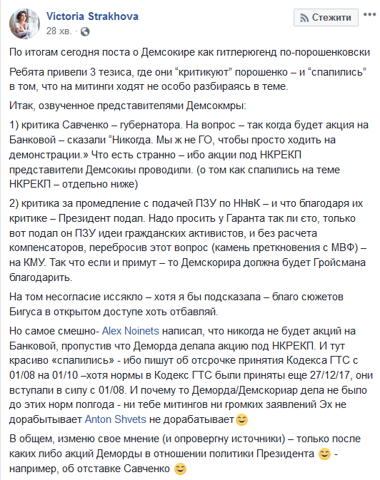 В общем, изменю свое мнение (и опровергну источники) - только после каких либо акций Деморды в отношении политики Президента - например, об отставке Савченко", - написала Страхова.