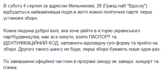 Каждый человек доброй воли, который хочет войти в историю украинского партстроительства, должен все бросить, взять паспорт и идентификационный код, заполнить гугл-форму и прийти на собрание. Второго такого шанса не будет, первое собрание бывают только один раз. По завершении официальной части в программе мероприятия как всегда: концерт и пьянка", - написали организаторы.