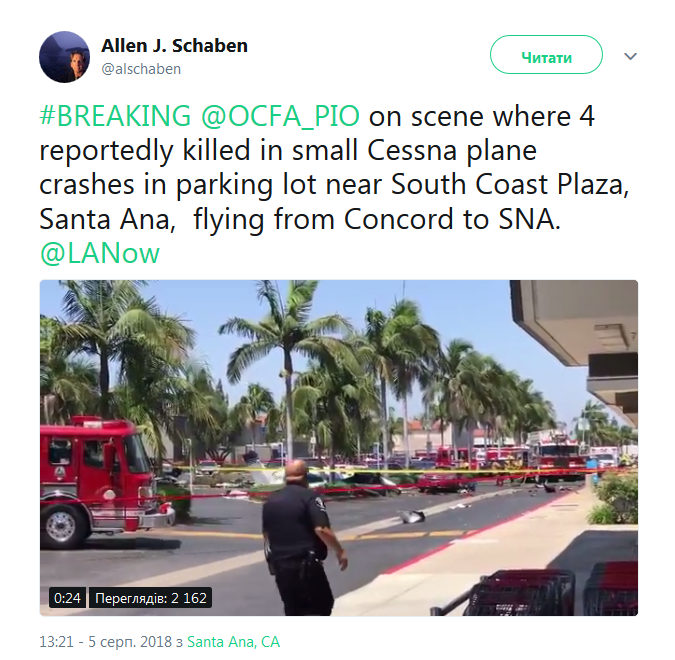 Как отметили в пожарной службе, самолет направлялся в местный аэропорт, когда произошла катастрофа. Крушение произошло всего в полутора километрах от южнокалифорнийского аэропорта Джон Уэйн. Улицы, ведущие к расположенному рядом с местом аварии торговым центром South Coast Plaza, перекрыты.