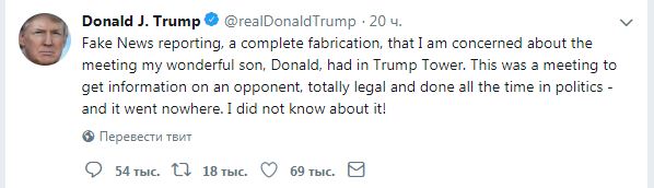 Президент США Дональд Трамп заявил, что его сын Дональд Трамп-младший встречался с представителями России в Нью-Йорке в 2016 году, чтобы получить данные об оппонентке отца на выборах - Хиллари Клинтон.