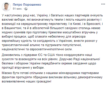 "В следующем году нас, Украину, и многих наших партнеров ожидают важные выборы, которые будут определять темпы и качество нашего развития и взаимодействия на среднесрочную перспективу. И в Киеве, и в Брюсселе, и в Вашингтоне, и в абсолютном большинстве западных столиц нет никаких сомнений о подготовке Кремлем масштабных вмешательств в избирательные процессы, чтобы сломать опасное для агрессора европейское единство и солидарность с Украиной, внести раскол в трансатлантический альянс и поддержать популистские, националистические и евроскептические политические силы. Договорились с лидерами ЕС и США тесно координировать наши усилия и взаимодействовать на всех уровнях. Поручаю Совету национальной безопасности и обороны Украины предусмотреть отдельное заседание по противодействию вмешательству в выборы", - говорится на странице президента.
