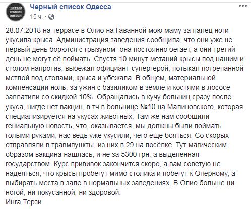 По словам девушки, инцидент произошел, когда ее мама сидела на террасе в пиццерии "Олио" на Гаванной. Крысы бегали прямо под ее столом, разогнать их пыталась только официант с метлой.