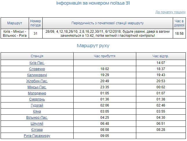 Поезд "четырех столиц" Киев-Минск-Вильнюс-Рига №31/32 будет выезжать из Киева в 14:07 и проводить в пути 19 часов (в обратном направлении - еще на полчаса дольше). Расписание движения опубликовала пресс-служба "Укрзализныци".