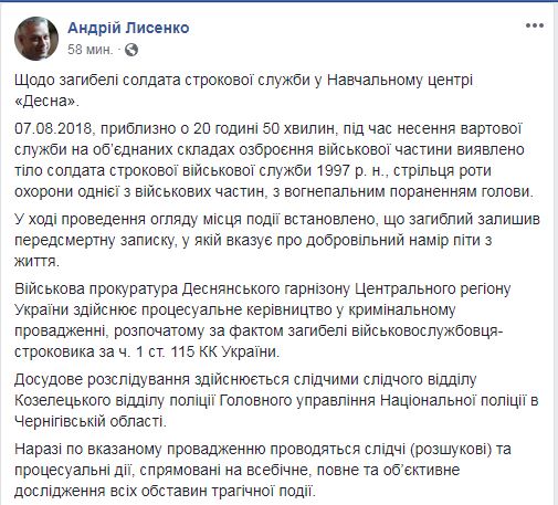 На месте гибели срочника в учебном центре "Десна" под Черниговом нашли предсмертную записку, в которой говорится о добровольном намерении уйти из жизни. Об этом сообщил пресс-секретарь Генпрокуратуры Андрей Лысенко на своей странице в Facebook.