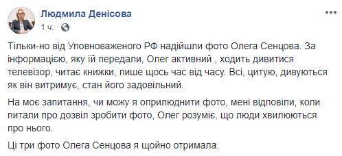 "Только что от уполномоченного РФ поступили фото Олега Сенцова. По информации, которую ей передали, Олег активный, ходит смотреть телевизор, читает книги, пишет что-то время от времени. Все, цитирую, удивляются, как он выдерживает, состояние его удовлетворительное", - прокомментировала Денисова.