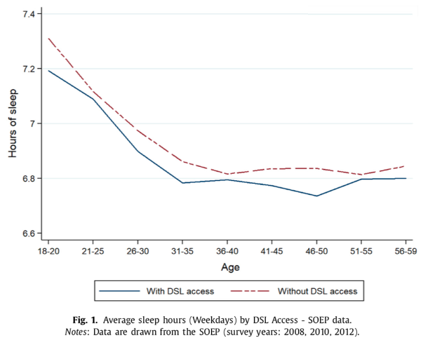 График, показывающий количество часов сна для людей с доступом к высокоскоростному интернету и без него. Francesco C. Billari et al / Journal of Economic Behavior, 2018