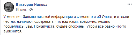 "У меня нет больше никакой информации о самолете и об Олеге, и я, если честно, начинаю подозревать, что над нами, возможно, нехило посмеялись, увы. Пожалуйста, будьте спокойны. Утром все равно что-то выяснится", - написала она.