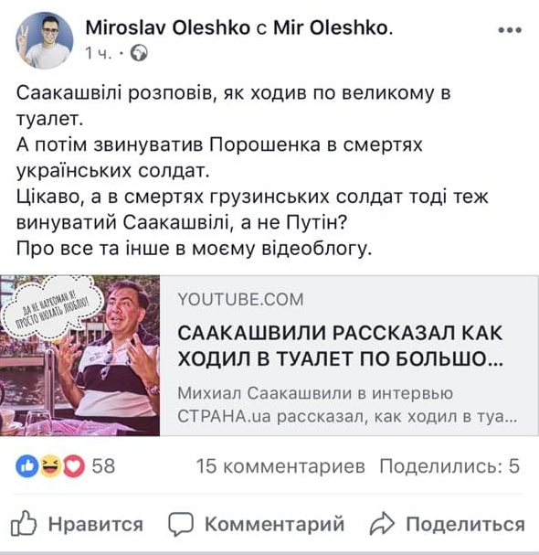 Любопытно, что из всего интервью с бывшим президентом Грузии и губернатором Одесской области блогеров, лояльных к президенту, зацепило именно это откровение Саакашвили - про походы в туалет.
