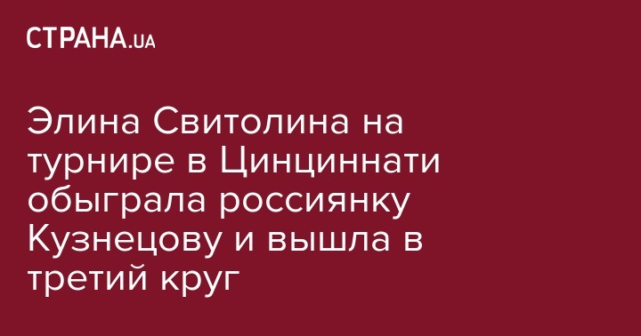 Первая ракетка Украины, теннисистка Элина Свитолина успешно преодолела второй круг турнира WTA серии Premier 5 (Western & Southern Open) в Цинциннати (США). Призовой фонд соревнований $2,875 миллиона.