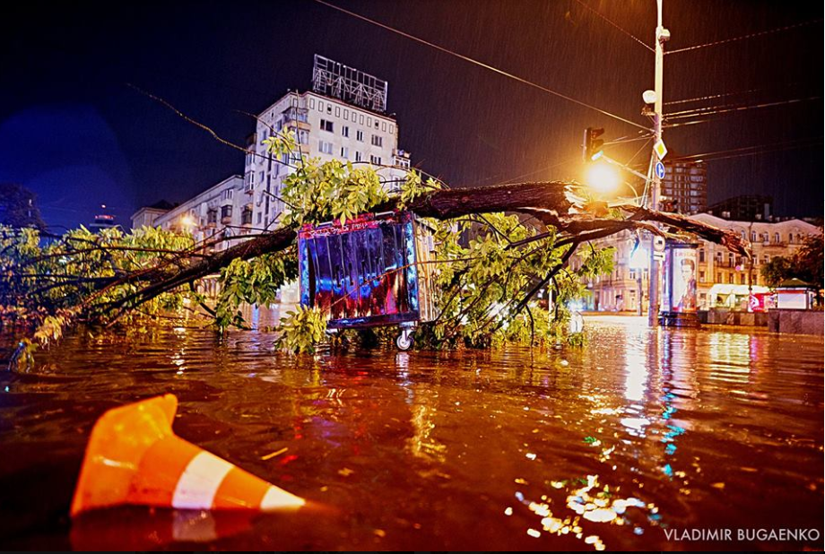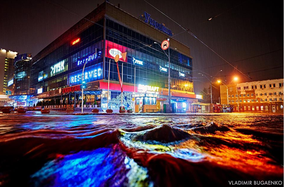 "Ночная прогулка была интересной! Иногда я даже рад, тому что обрабатываю ночью. Таких потоков давно не видел! Даже дерево приплыло, а градом разнесло несколько вывесок. Красиво и стремно одновременно! Кое-где глубина была по пояс", - написал фотограф Владимир Бугаенко.