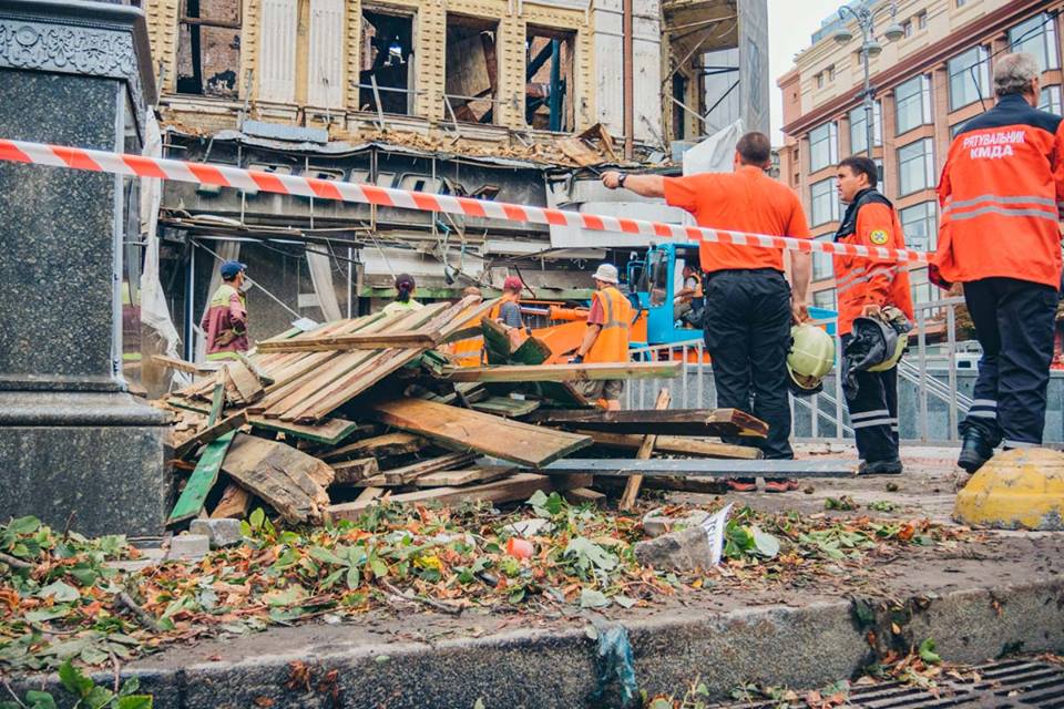 Также мы писали, что в самом центре Киева, 16 августа, произошло очередное ЧП. Здесь, на Крещатике, напротив центрального универмага, обрушилась часть горевшего ранее здания, фасад которого был скрыт защитной сеткой.