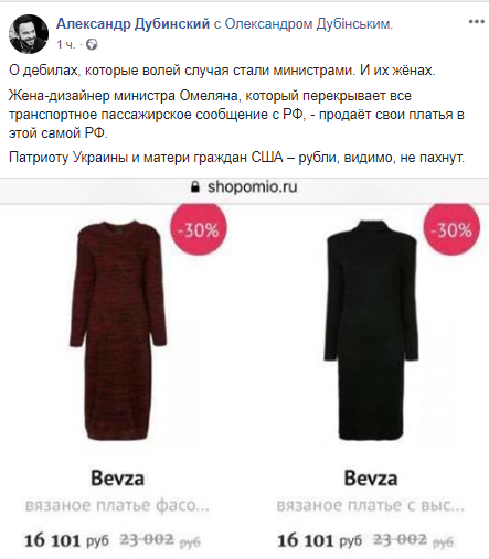 "О дебилах, которые волей случая стали министрами. И их жёнах. Жена-дизайнер министра Омеляна, который перекрывает все транспортное пассажирское сообщение с РФ, - продаёт свои платья в этой самой РФ. Патриоту Украины и матери граждан США – рубли, видимо, не пахнут", - написал на своей странице в Facebook Дубинский.