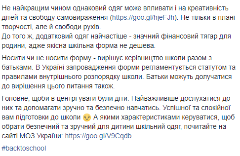 "Сейчас родители все больше дискутируют, как ребенок будет учиться в школе успешнее - в школьной форме или в одежде, которую выберет сам. Это довольно спорная тема, ведь мнения как родителей, так и ученых по этому поводу разделяются. Сторонники школьной формы считают, что это обязательный атрибут в учебном процессе. Он влияет на производительность обучения, так как дети имеют возможность концентрировать внимание на информации и не заморачиваются внешним видом. Как следствие, они становятся более внимательны и старательны. Еще один аргумент "за" - лучшее поведение и дисциплина. Благодаря школьной форме улучшается посещаемость уроков, дети становятся более мотивированными и серьезными", - написала Супрун.
