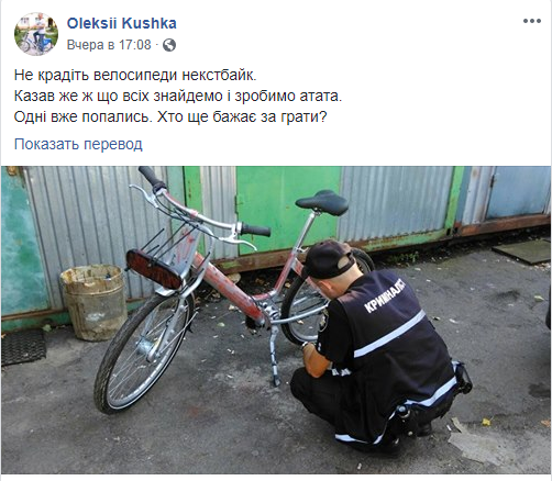 В Киеве угонщикам не удалось похитить велосипед Nextbike. Об этом сообщил руководитель компании Алексей Кушка на своей странице в Facebook.