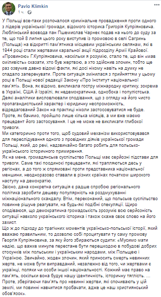 "Виной" Г.Куприяновича, насколько я понимаю, стало то, что он "имел смелость" сказать, кто был жертвой, а кто совершил преступление, то есть еще раз озвучил давно известные факты, которые до сих пор никому даже в голову не приходило отрицать. Однако ситуация изменилась с принятием в этом году в Польше новой редакции Закона "Об Институте национальной памяти". Она, как известно, вызвала острую международную критику, в частности в Украине, США и Израиле, как недемократическая, однобокая и популистская", - написал Климкин.