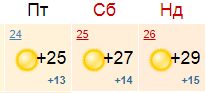 Сайт Weather.com сообщает о трех солнечных днях с 24 по 26 августа включительно. На День независимости днем до +24, на выходных - до +29...+30.