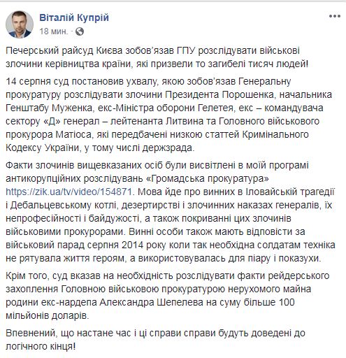 "14 августа суд постановил определение, которым обязал Генеральную прокуратуру расследовать преступления Президента Порошенко, начальника Генштаба Муженко, экс-Министра обороны Гелетея, экс – командующего сектора "Д" генерал – лейтенанта Литвина и Главного военного прокурора Матиоса, предусмотренных рядом статей Уголовного Кодекса Украины, в том числе по госизмене", - сообщил он.