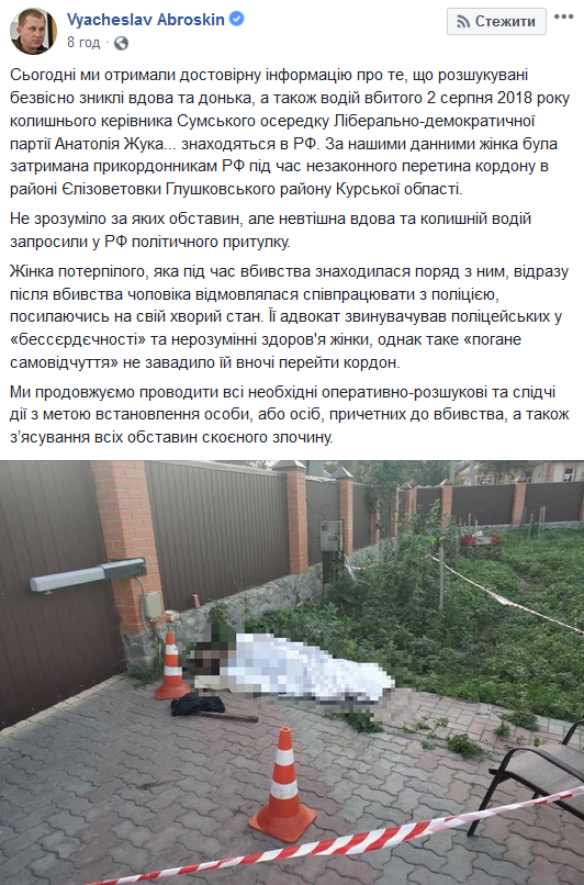 "Сегодня мы получили достоверную информацию о том, что разыскиваемые без вести пропвшие вдова и дочь, а также водитель убитого 2 августа 2018 бывшего руководителя Сумского отделения Либерально-демократической партии Анатолия Жука... находятся в РФ. По нашим данным женщина была задержана пограничникам РФ при незаконном пересечении границы в районе Елизаветовки Глушковского района Курской области.