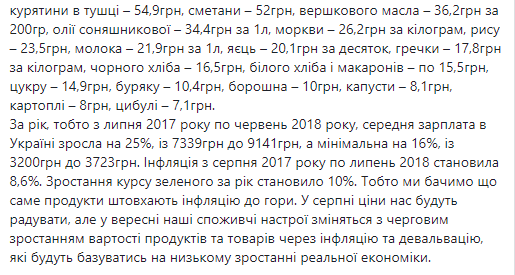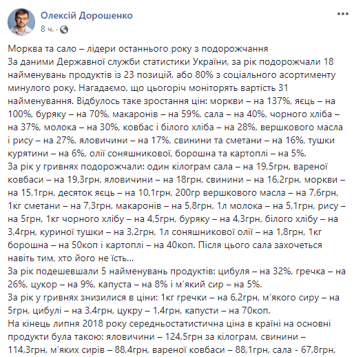 "За год в гривнах подорожало: один килограмм сала - на 19,5 грн, вареной колбасы - на 19,3 грн, говядины - на 18 грн, свинины - на 16,2 грн, моркови - на 15,1 грн, десяток яиц - на 10,1 грн, 200 гр сливочного масла - на 7,6грн, 1 кг сметаны - на 7,3 грн, макароны - на 5,8 грн, 1 л молока - на 5,1 грн, риса - на 5 грн, 1 кг черного хлеба - на 4,5 грн, свеклы - на 4,3 грн, белого хлеба - на 3,4 грн, куриной тушки - на 3,2 грн, 1 л подсолнечного масла - на 1,8 грн, 1 кг муки - на 50 коп и картофеля - на 40 коп. После этого сала захочется даже тем, кто его не ест..." - сказано в сообщении.