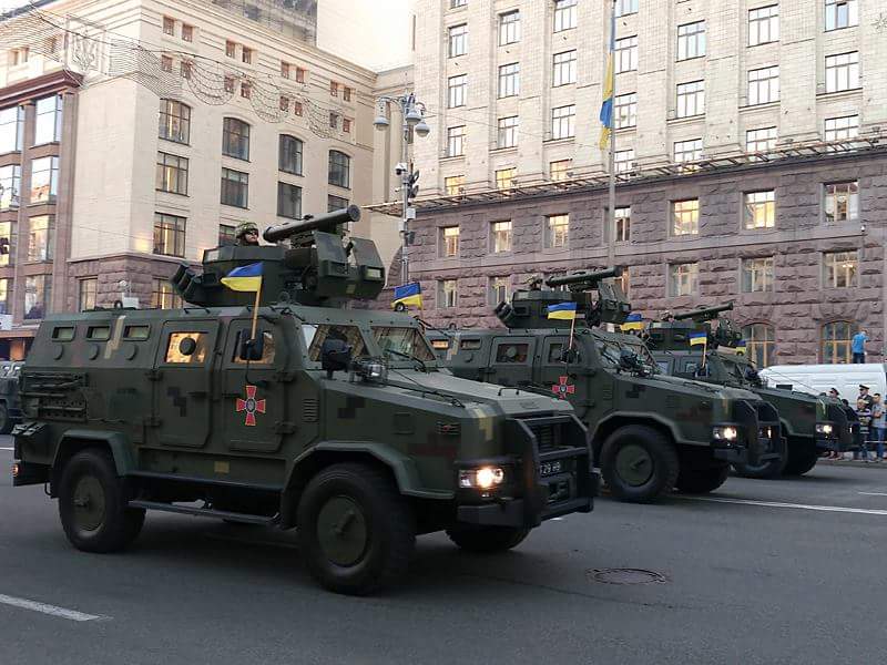 По главной улице Киева сначала прошли украинские и иностранные военные, в том числе британские, грузинские и американские. Затем - системы залпового огня ("Верба", "Смерч", "Ураган"), САУ (в том числе новая "Богдана"), "Пион", "Гиацинт"), тактический ракетный комплекс "Точка У", бронеавтомобили "Кугуар", "Козак".