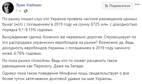 Вынужденная сделка. Конечно же нереально дорогая. Спровоцирует ли это распродажи украинских евробондов на рынке? Возможно да. Ведь доходность евробондов Украины с погашением в 2019 году намного ниже: 6.76% годовых. Но пока рынки спокойны. Ведь кто-то может расценить такое размещение как Перемогу. Даже на Западе. Однако пока такое поведение Минфина лишь свидетельствует о все более тугом затягивании долговой удавки на шее Украины", - написал Эрик Найман.