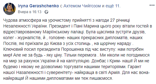 "Была счастлива встретить друзей, коллег - журналистов, и, главное- наших прекрасных дипломатов, наших послов, которые приехали в Киев из всех столиц на ежегодное совещание", - написала она. На фото Ирина Геращенко стоит под руку с Александром Моциком, которого в ночь с 24 на 25 августа задержали на площади Шевченко в Киеве, когда он ехал по кольцу против движения.