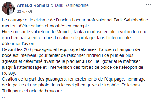 Во Франции чемпион страны по боксу предотвратил захват самолета. О данном инциденте в Facebook рассказал Арно Ромеро.
