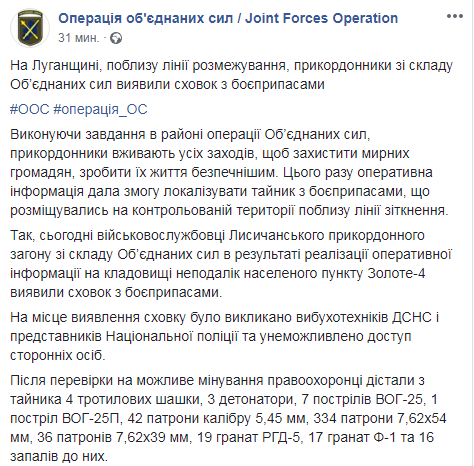 В зоне ООС военнослужащие Лисичанского погранотряда нашли на подконтрольной территории, вблизи линии столкновения, тайник с боеприпасами. Он был найден на кладбище возле поселка Золотое-4 (часть г.Золотое Луганской области), занятого ВСУ в конце июня.