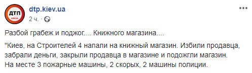 "Киев, на Строителей, 4 напали на книжный магазин. Избили продавца, забрали деньги, закрыли продавца в магазине и подожгли магазин", – указано в опубликованном сообщении на странице портала в Фейсбук в среду вечером.