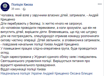 "С мужчиной проводили переговоры, а когда поняли, что он не выпустит детей, решили действовать. Удостоверившись, что во время штурма дети не пострадают, спецподразделение получило команду начинать силовую часть операции. Детей освободили, а злоумышленника задержали", - цитирует пресс-служба начальника полиции Киева Андрея Крищенко.