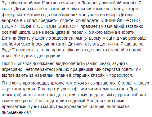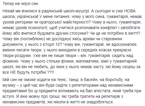 Писательница возмущена тем, что ее сын  из-за решений чиновников МОН не сможет посещать занятия по "нетехническим" дисциплинам и вынужден дополнительно тратить время на занятия с репетиторами по математике и физике из-за того, что они влияют на общий балл школьного аттестата.