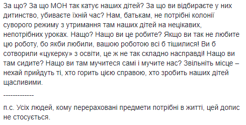 "За что? За что МОН так мучает наших детей? За что вы отбираете у них детство, убиваете их время? Нам, родителям, не нужны колонии строгого режима по содержанию там наших детей на неинтересных, ненужных уроках. Зачем? Зачем вы это делаете?", - эмоционально заявила в соцсети Ницой.