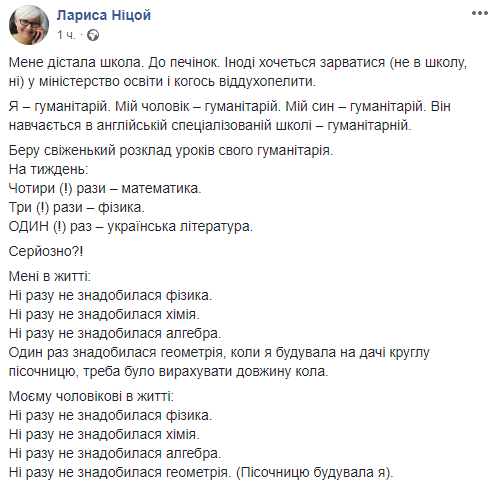 Мне в жизни ни разу не понадобилась физика. Ни разу не понадобилась химия. Ни разу не понадобилась алгебра. Однажды понадобилась геометрия, когда я строила на даче круглую песочницу, надо было вычислить длину окружности", - отметила в своем посте Лариса Ницой.