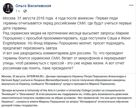 Журналист Ольга Василевская обращает внимание на избирательность Банковой по комментированию этого вопроса: "Москва. 31 августа 2018 года. 4 года после аннексии. Первая леди Украины отчитывается перед российскими СМИ, где будут учиться первые дети Украины.