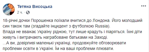 Журналист Татьяна Высоцкая также возмущена: "18-летние дочери Порошенко поехали учиться в Лондон. Его младший сын также там (вспомните инцидент с футболкой Russia).