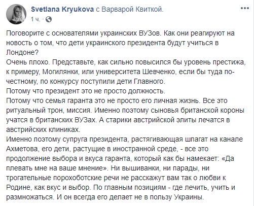 Журналист Светлана Крюкова пишет о том, что дети президента должны учиться на родине: "Поговорите с основателями украинских ВУЗов. Как они реагируют на новость о том, что дети украинского президента будут учиться в Лондоне?