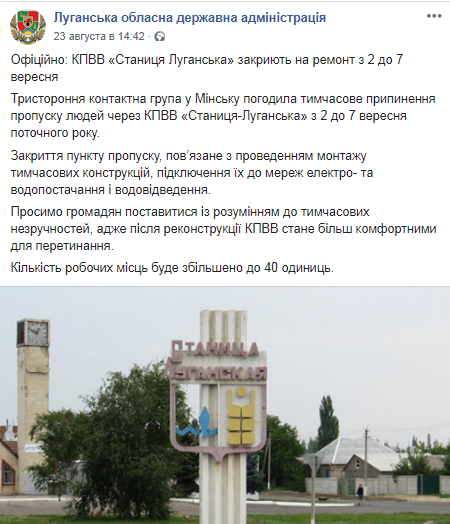 Пункт пропуска не будет работать до 7 сентября из-за ремонта, который был согласован в рамках Минских договоренностей. После ремонта увеличится количество рабочих мест для сотрудников пункта пропуска, также сообщается о том, что будут созданы более комфортные условия для людей, пересекающих линию разграничения.