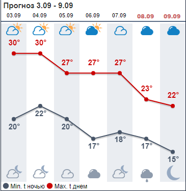 Еще один сайт Weather.com обещает  +28...+32 с понедельника по среду. В четверг +25 днем. В пятницу до +27. На выходных +25...+26. Всю неделю переменная облачность без осадков.